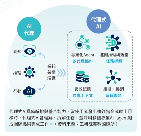 而產業趨勢正從生成式AI走向代理式AI(Agentic AI)和實體AI(Physical AI),代理式AI具備編排與整合能力,當使用者發出複雜指令或給出目標時,代理式AI會理解、拆解任務,並呼叫多個專業AI Agent組成團隊協同完成工作。