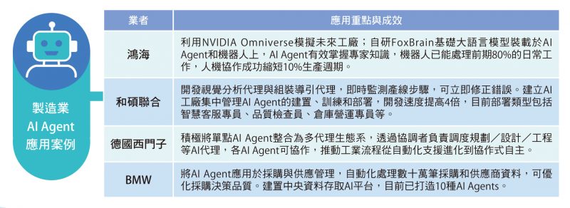AI Agent於製造業場域的應用,已經從資料分析演變成能自主決策、執行多步驟複雜任務的數位勞動力。工研院產科國際所分析師黃筱雯指出,製造業在導入AI Agent時,常會面對基礎設施導入成本高、技能缺乏、資安風險與演算法透明度等挑戰。一旦成功落地,它將能多方面用於生產端、供應鏈管理、企業管理決策,以及實體AI機器人等領域。