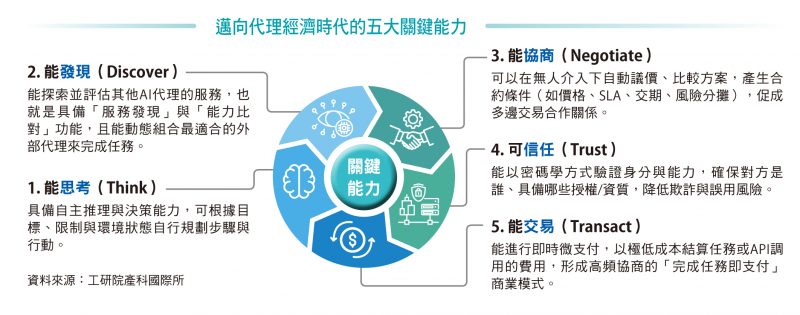 變革四:加速跨域合作。AI Agent將使用者需求集中到單一入口,結合專業服務模組化,再搭配互通與支付協定,重構客戶體驗與價值鏈。包括Google、微軟、AWS、OpenAI等掌握平台入口與支付管道,均位居有利發展的位置。此外,Accenture、PWC等專業顧問公司,則將專業知識系統化並模組化,與科技平台如NVIDIA整合,將服務從人工諮詢轉為AI輔助即時解答。