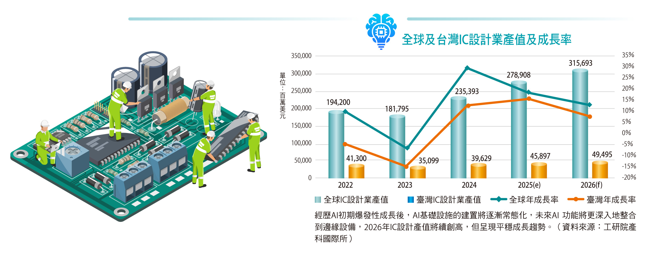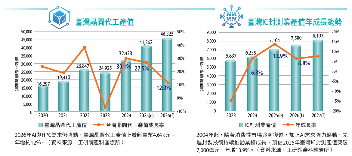 AI爆發性成長正重塑產業格局,掌握AI商機是成功的關鍵。由於全球8成AI晶片來自臺灣,臺灣半導體業已搭上這班「AI特快車」。工研院產科國際所資深研究員王宣智預估,2025年臺灣半導體產業產值將達新臺幣6.5兆元,年成長率22%,預估這股強勁動能將延續到2026年,產值將來到7.1兆元,年成長率10.0%。