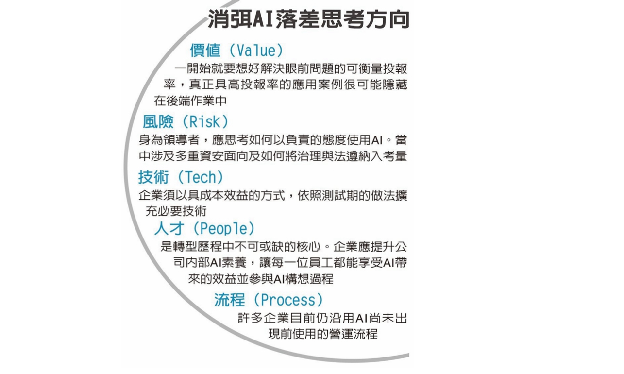 若要消弭AI落差,可從五種關鍵思維發想。第一項是「價值(Value)」,一開始就要想清楚解決問題的投報率,許多企業在思考價值時,會以高可見度的使用案例為優先,但未必是高投報率。真正高投報率的應用案例,很可能隱藏在後端作業中,不斷默默提升整體效率、創造價值。