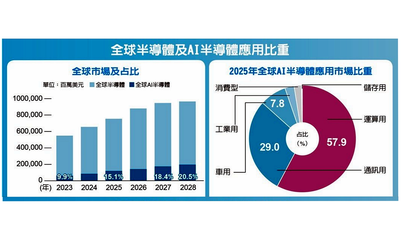 AI應用已成為推動半導體市場成長的重要引擎。市場研究機構Gartner預估,全球AI半導體市場占整體半導體市場比重從2023年的9.9%成長至2028年20.5%。2025年AI半導體市場估將占全球半導體市場的15.1%,應用領域以運算用(57.9%)與通訊用(29.0%)為主,其次為車用(7.8%)等。整體而言,AI帶動的高效能運算與通訊需求,已成為推升半導體產業成長的關鍵動能。