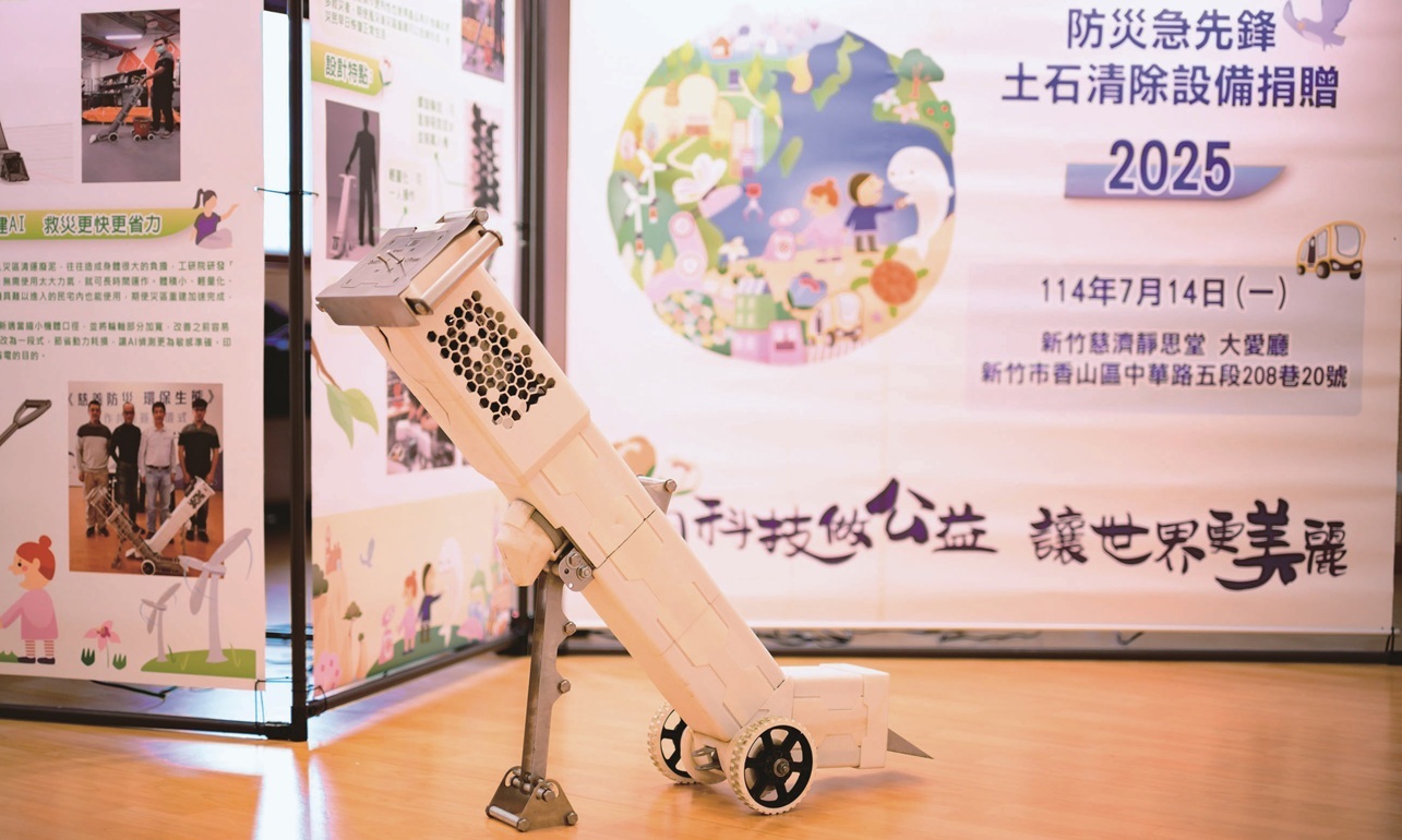 為此工研院與慈濟基金會8年前即開始研擬,針對風災後泥沙清運與安全風險進行討論,逐步將第一線需求轉化為研發方向,陸續開發「螺桿式泥沙清除設備」、「微型履帶清運載具」與「省力外骨骼輔助系統」等系列救災工具,專門應用於巷弄狹窄、地形破碎且人力難以進入的災後現場,協助第一線志工安全有效率地完成清運與復原作業。